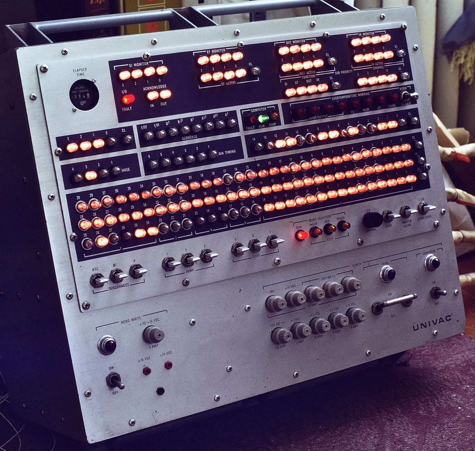Those neon indicators/switches were interesting in themselves. As I recall, they were powered by low voltage DC and each one had a miniaturized inverter to generate the greater than 90 volts required for the NE2-type neon lamps. Their state was directly controlled by the DTL logic levels which switched the inverter on and off.
