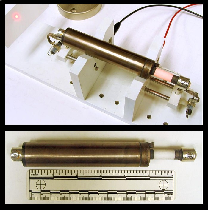 The HeNe laser tube is the classic Spectra-Physics side-arm design but with the anode electrode mounted less than halfway along the length of the bore. The same tube with the anode mounted at the end would produce around 4 to 5 mW. In fact, the Spectra-Physics 157 (3 mW) and 159 (4 mW) lasers are virtually identical except for the tube's anode location and the use of a larger power supply. (The SP-156 is likely similar as well but I haven't seen one to confirm.) This also means that the longitudinal mode structure and thus mode sweep will be similar for all these lasers.