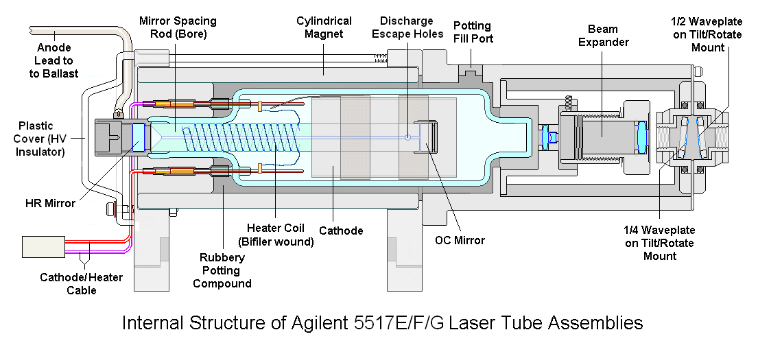 However, even the new ballast resistors doesn't seem to cure all lasers. At this point, I am fairly convinced that there must be internal tube problems with some of them. My wild guess would be that it has to do with contact between the cathode-end mirror mount and the thin film cathode deposited on the glass envelope. Or that in higher mileage tubes, the work function of the thin film cathode becomes high enough that the discharge occasionally jumps between it and the cathode mirror mount or other structure. Also see the section: The Zygo 7701/7702 HeNe Laser Tube.