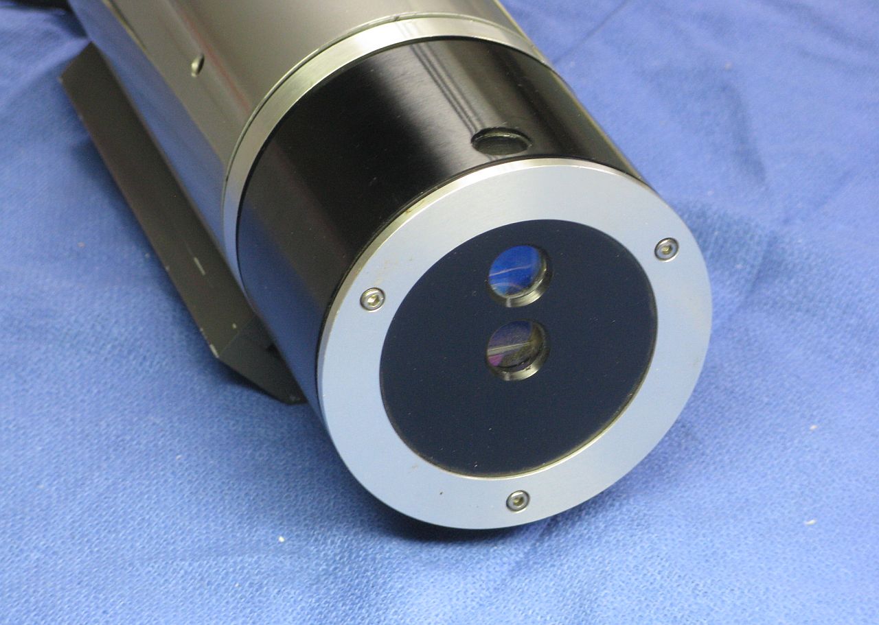 The is a stabilied HeNe laser head made by Perkin Elmer. It consists of a two-Brewster tube with a heated filament in a short squat laser head sealed enclosure. A separate large controller/power supply attaches via a cable the thickness of a garden hose. The locking scheme is not known definitively but is believed to be Lamb Dip based on the presence of both a heater and PZT. (Power supply photos courtesy of Bob Arkin.)