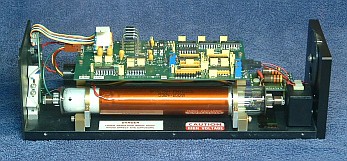 The SP-130B uses a HeNe tube with Brewster windows and external mirrors all in a self contained box. The laser is cute - about 13.5"(L) x 4"(W) x 5"(H) and weighs about 11 pounds (most of the weight being the brute force power supply, chassis, and covers. Well, what else is there?)! Unfortunately, the tube died since the second photo was taken due to unknown (but natural) causes. It would appear that the stress of the thermal expansion of one of the seals after being idle all these years caused it to open up after a few minutes of operation (though the tube had leaked somewhat as well and there was no beam even while there was a discharge glow). I have not yet found the seal problem though. The tube in the other sample was totally dead - up to air showing signs of previous attempts at repair.