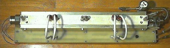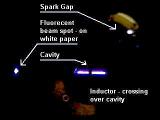 The cavity is only 1.5" in length. This laser sure is a great example of the N2 UV lasing properties. When the spark gap's pressure is too low, the output power drops off substantially. With the spark gap's N2 pressure at atmospheric - it will not even lase. I have been using between 15 to 22 psi in the spark gap. These pressures seem to work well with this laser. With 15 psi, the pulse repetition is more uniform than at 22 psi. The cavity is not sealed so a flowing pressure of +1 or less psi helps keep the output stable.