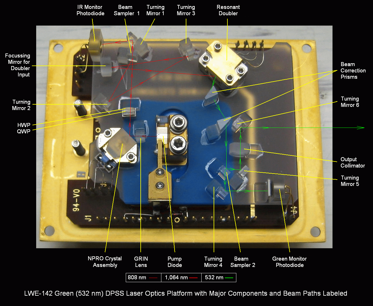 A photo of the inside of the very similar 543 nm model is shown in CNI MGL-III-543/100 Green (543 nm) DPSS Laser Head Interior (and described in the next section). (The only significant physical difference is that the 532 nm version lacks the light feedback components.) The construction is so remarkably similar to that of the laser at the heart of the saga describe at Reconstruction of an 80 mW Green DPSSFD Laser that I am forced to conclude that CNI (or its predecessor in 2000, 12 years ago!) must have been the manufacturer of that one as well. Or, at least that unfortunately, CNI copied from them. There have been some improvements such as the use of a standard laser diode (similar to C-mount) instead of a bare chip, and there are no anamorphic prisms for pump beam shaping, only a single lens. But the way the cavity is put together is very similar.