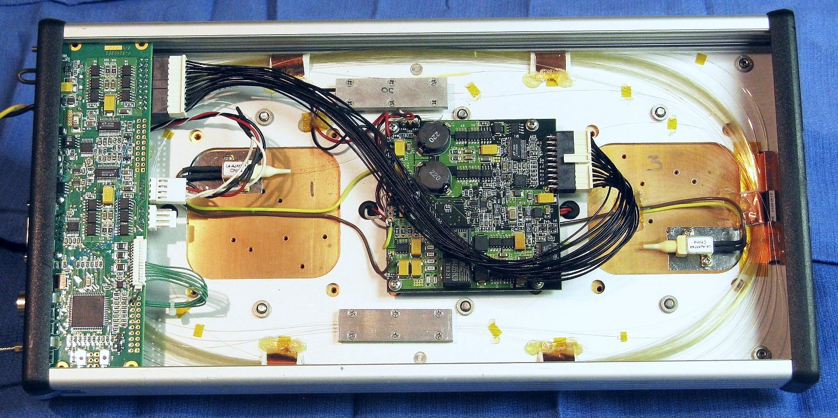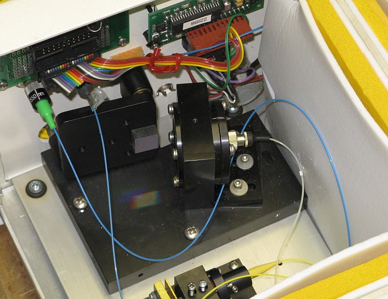 The PCB on the left has the USB and RS232 interfaces and remaining logic functions as well as the temperature controller for the HR FBG.