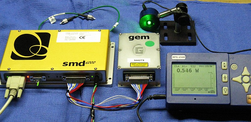 Well, I knew I was taking a risk when I ordered it. This is an insurance-funded replacement for a 25 mW, 488 nm argon laser that was damaged in an incident involving toxic mold (long story, don't ask). That argon had 2,500 hours on it but was still doing fine until the microbes hit. This DPSS unit (which is sitting beside me right now, illuminating the wall) is far more fun. I essentially got it for $600, since that's what I paid for the argon to begin with. It's real hard to believe this is a lemon, but I guess I'll find out in a couple months. If and when it checks out, I think I'll probably just disassemble it for parts and educational value rather than attempt to get it repaired by the manufacturer. If it's the pump diode that goes out, I may be able to replace it with a 1.2 W fiber-coupled unit I have and a GRIN lens. It's frequency is tuned for YLF (797 nm), but I'ms sure I'd get a few tens of mW out of it at 532 nm - assuming the original diode can be removed without messing with the vanadate and KTP. If all else fails, it sure is a neat little fan-cooled case! Oh, well.