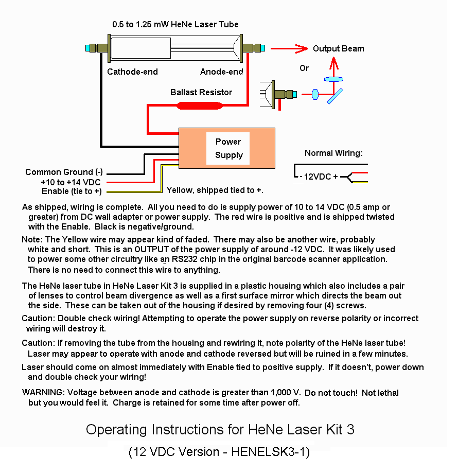 12 VDC version (HENELSK3-1): (See Operating Instructions for HeNe Laser Kit 3 - 12 VDC Version).