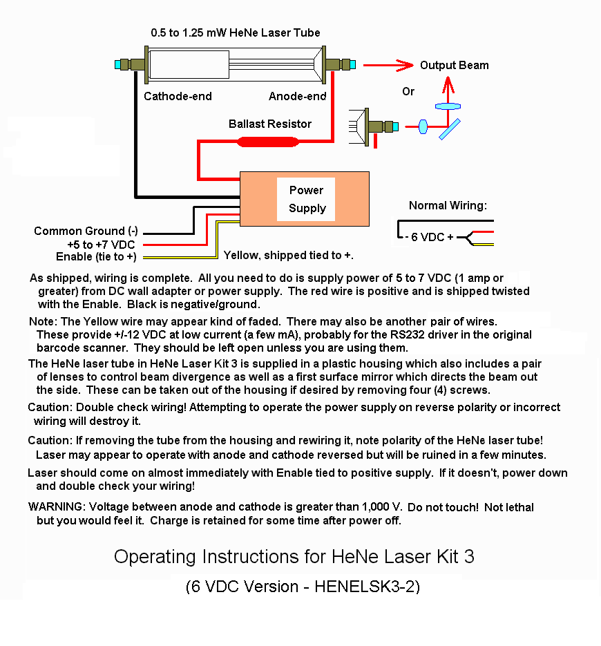 6 VDC version (HENELSK3-2): (See Operating Instructions for HeNe Laser Kit 3 - 6 VDC Version).