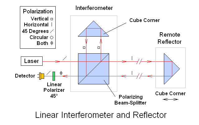 The beams reflected to the two arms of the interferometer then have orthogonal polarization which effectively makes them independent until they are combined at the detectors and means the maximum amount of the laser optical power is available - nothing exits out the unused side of the beam-splitter as it would in the basic Michelson setup, above. (However, about half the power is lost in the detection scheme that is typically used.) The result is then one of the most widely used configurations - the Linear Interferometer (LI).