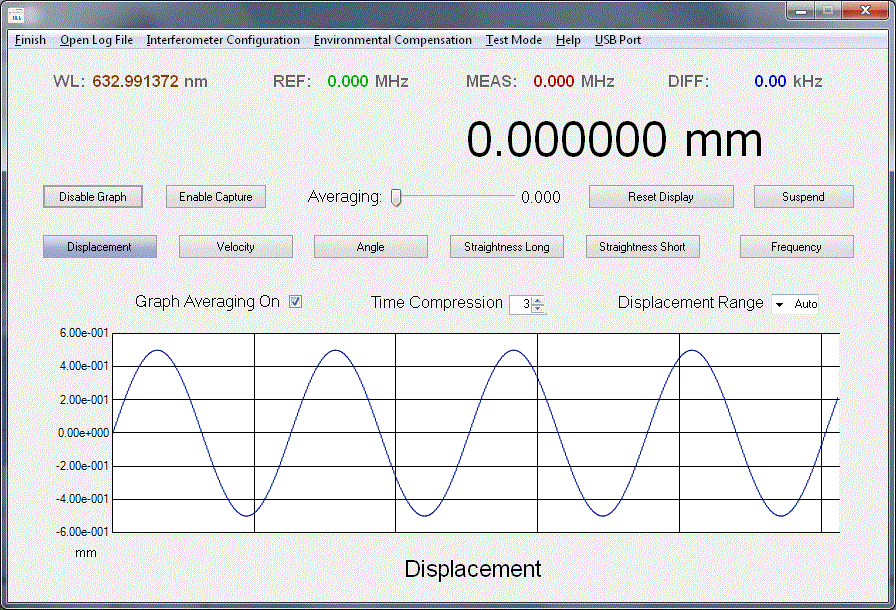 When started, the µMD2 GUI (henceforth simply called the "GUI") comes up in Displacement mode with graphing enabled. The only action required by the user is to select the USB COM port. Once selected, the readout and graph will begin displaying the interferometer data.